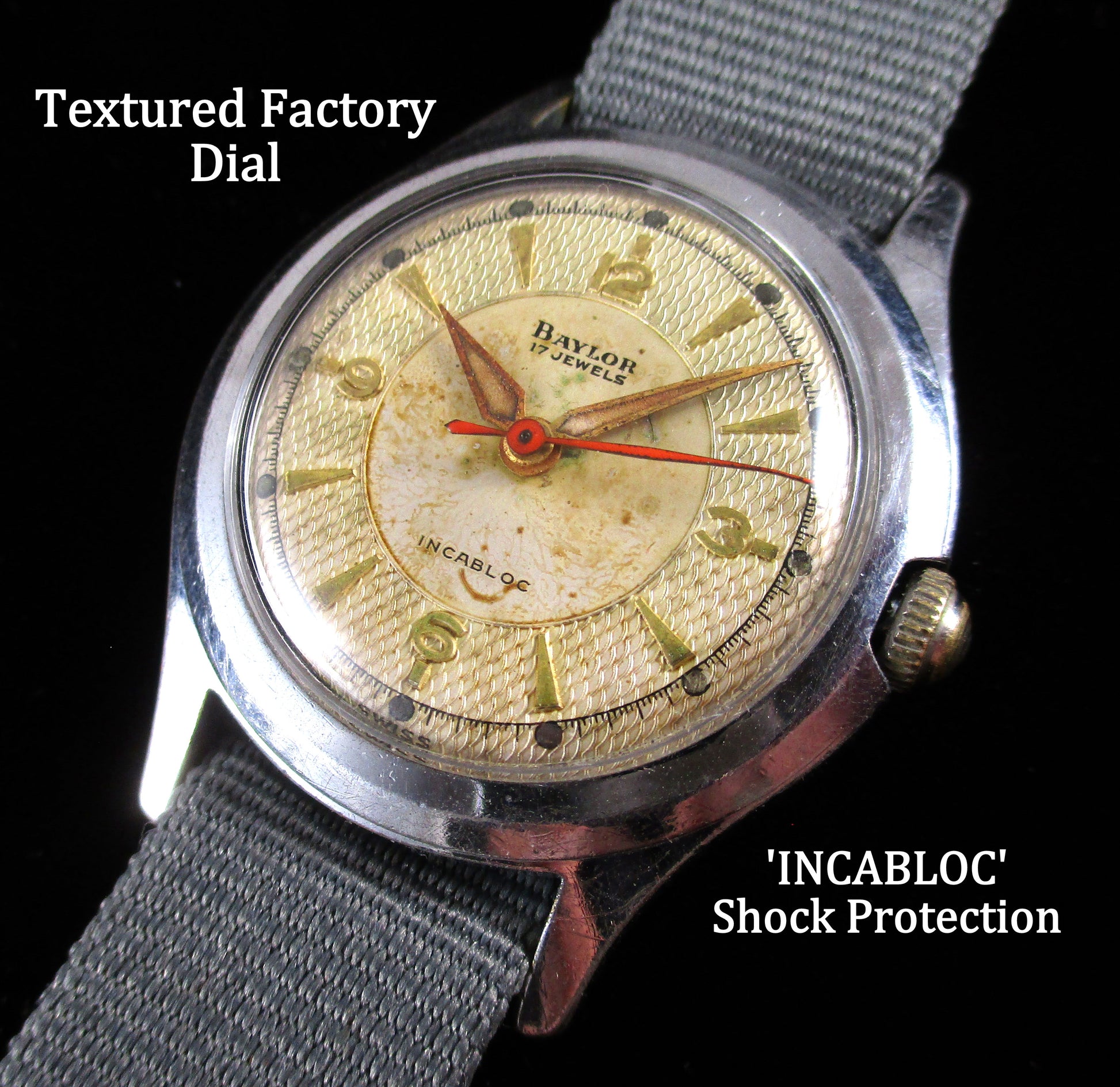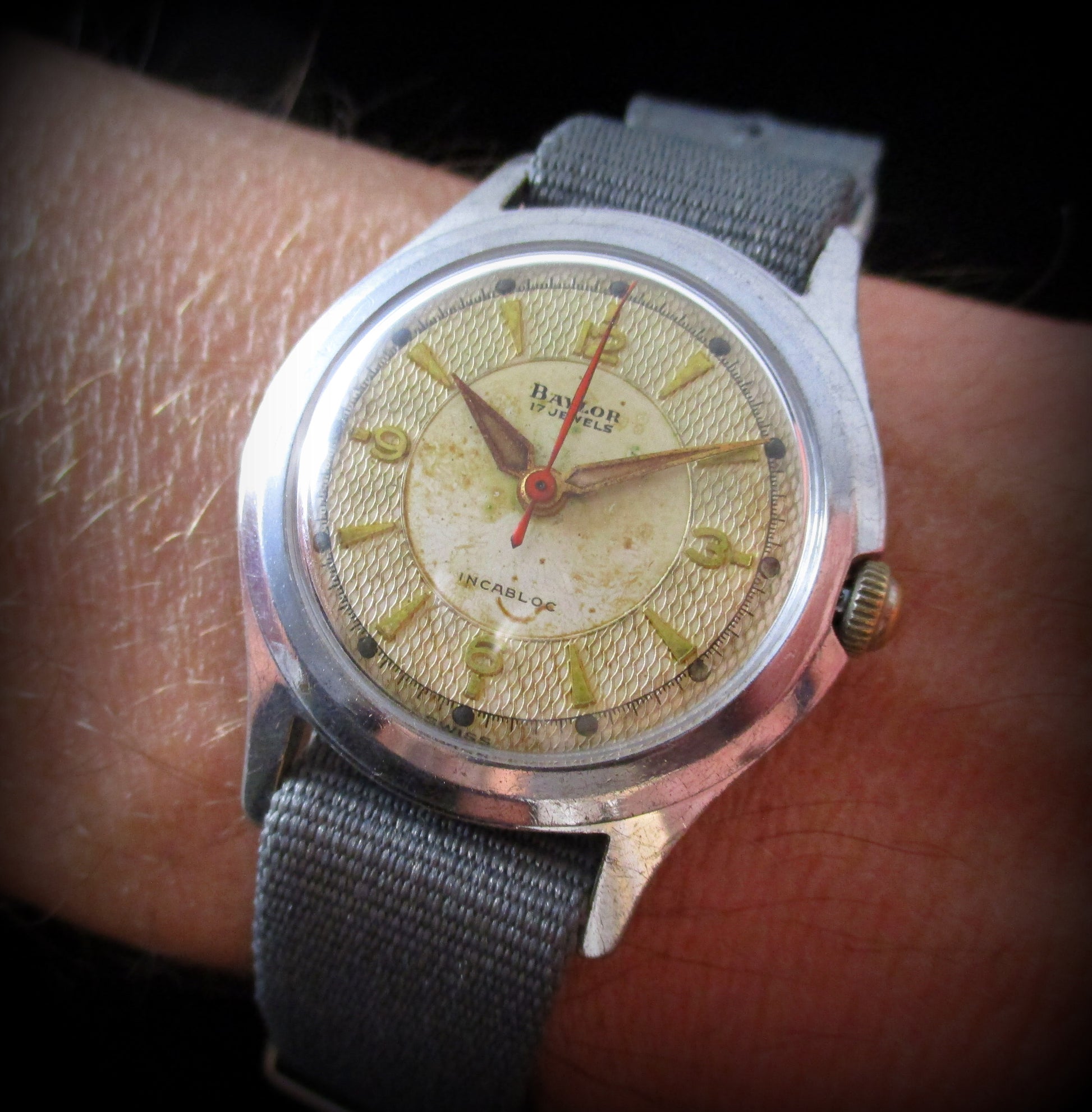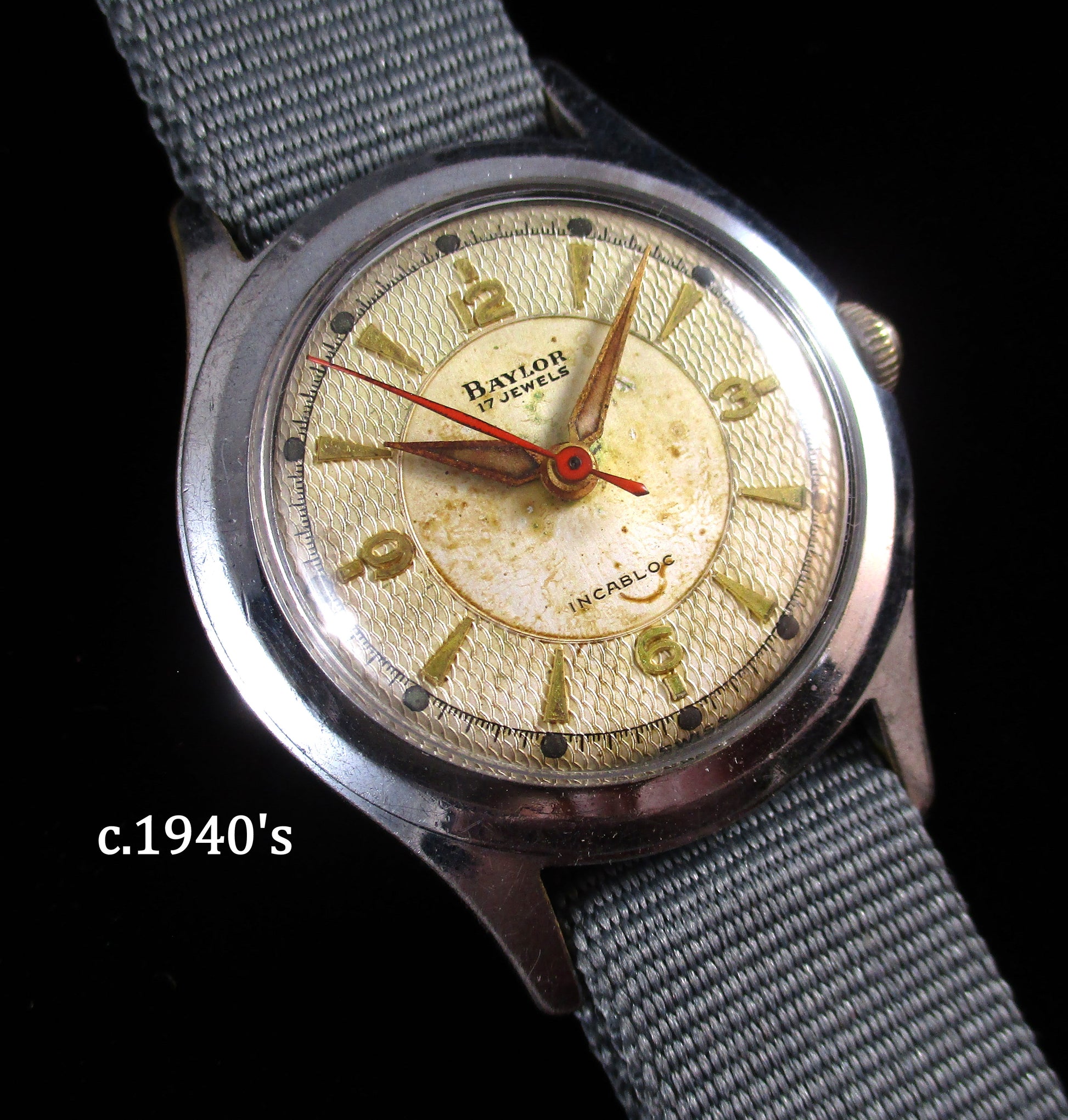 **The burns on the dial finish is seen often with these largely filled radium hands. When the radium was new it would glow bright but would damage the finish over time... 80yrs later and safe to wear.**