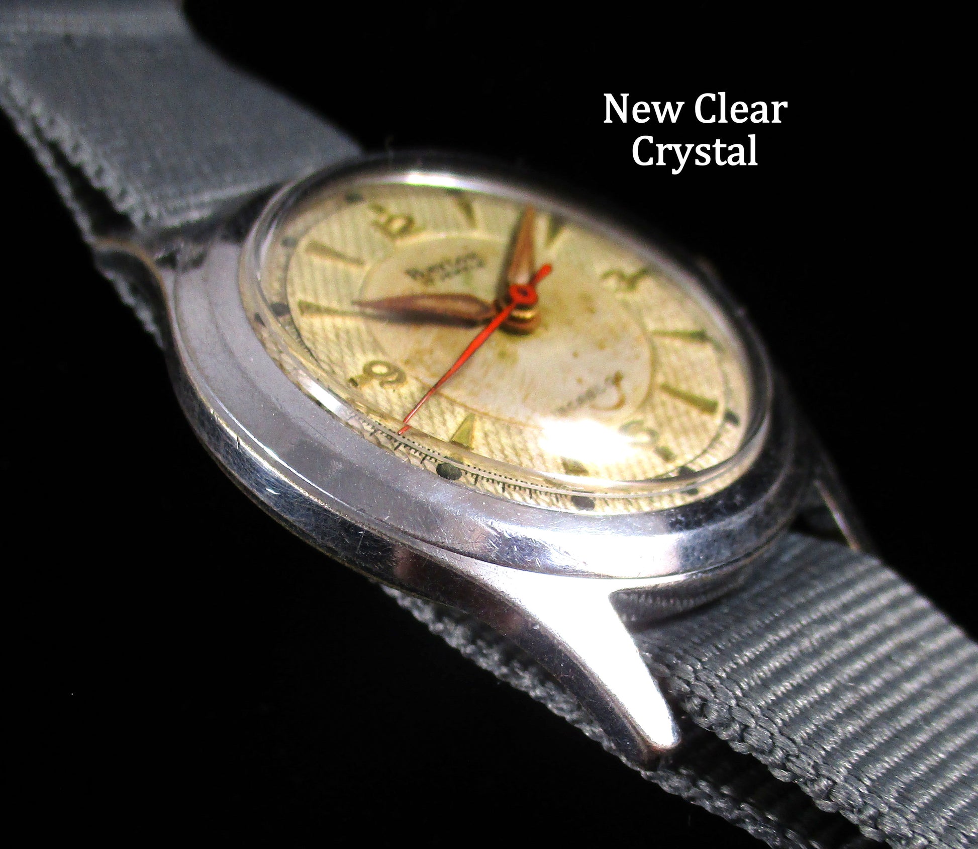 The WW2 military style case measures 32mm across with a heavy nickel plate. The deep threaded stainless screw back/gasket was used for their military watches to help with water resistance. The original filled hands really stand out against the tropic dial, and all protected by a new high polished crystal.
