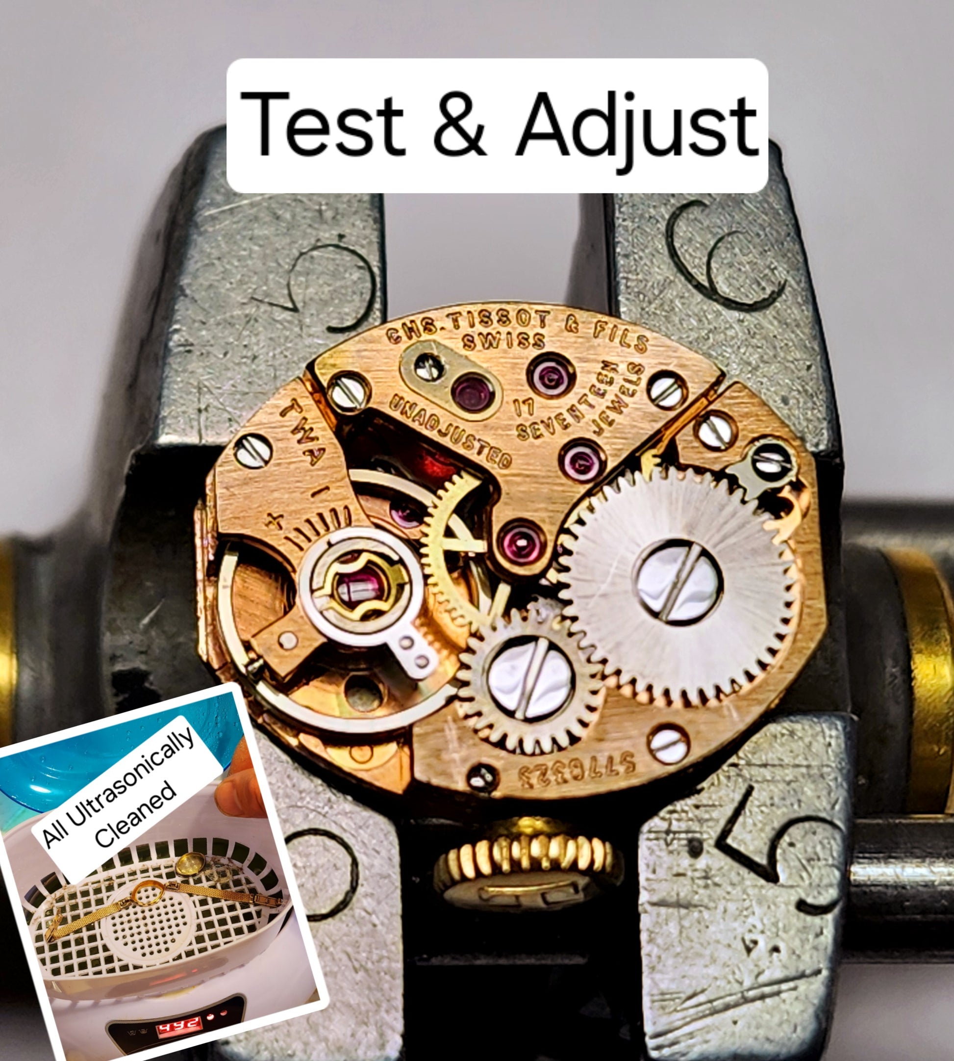 I have completely overhauled the 17 Jewel, shock protected movement. That means every removable jewel, mainspring, balance wheel & hairspring all cleaned. Then, reassembled, oiled & timed. It is running very strong and accurate as an Tissot/Omega should.